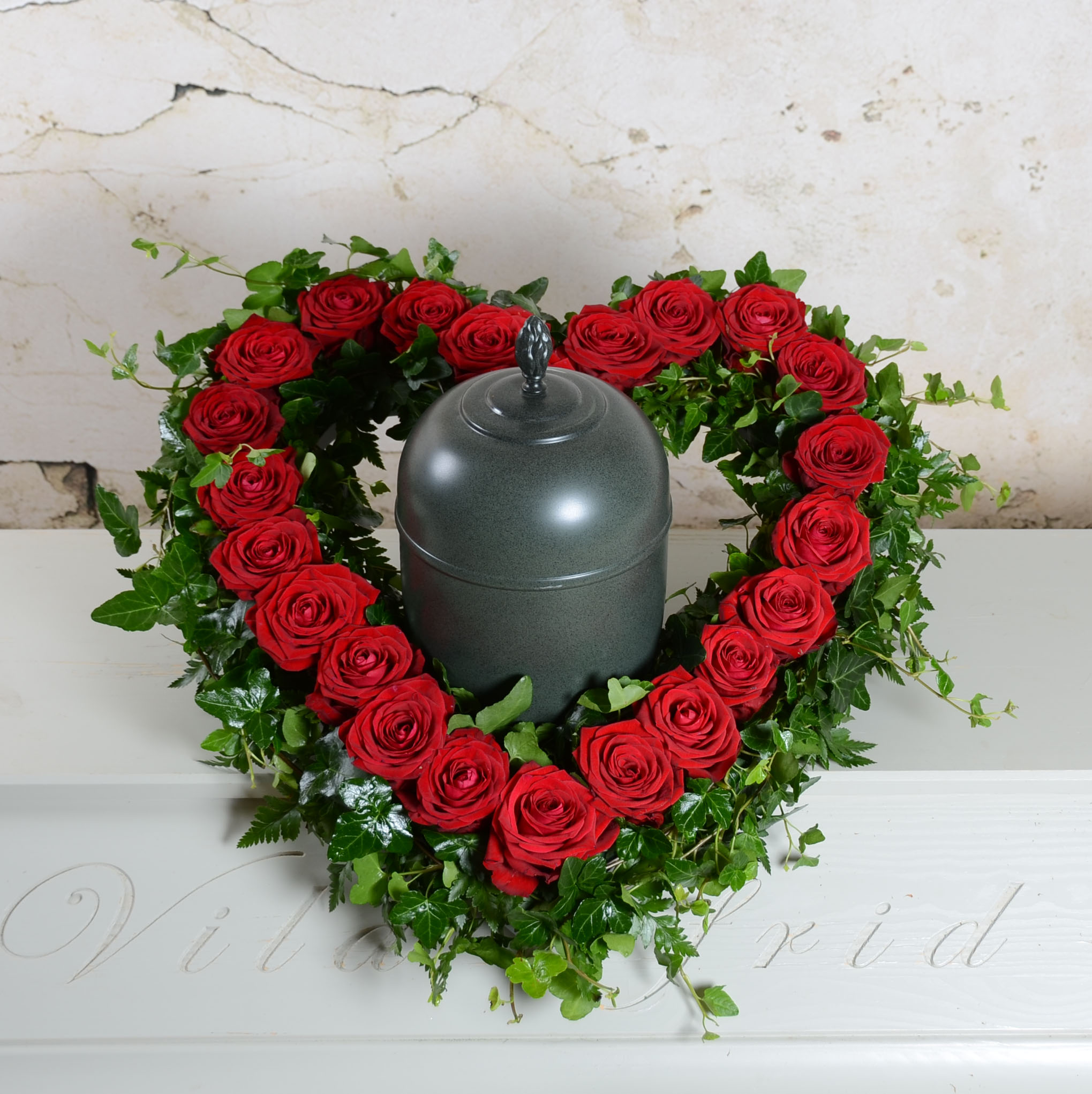 Öppet hjärta med röda rosor, murgröna och läderblad. Kombinera gärna med band.