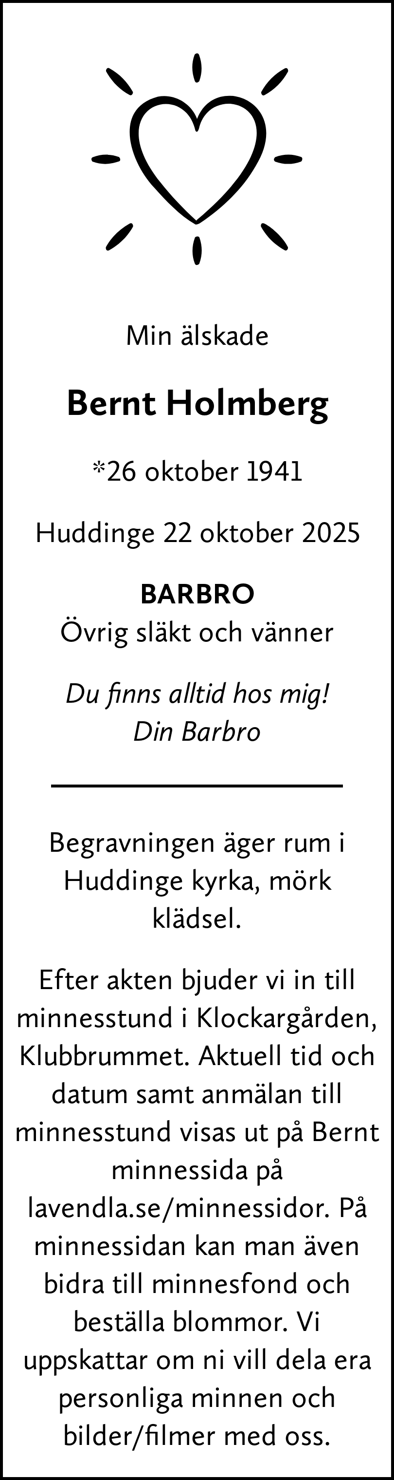 Var med oss och dela hälsningar, bilder och filmer. Tillsammans kan vi återuppleva minnen och fina stunder med Bernt.