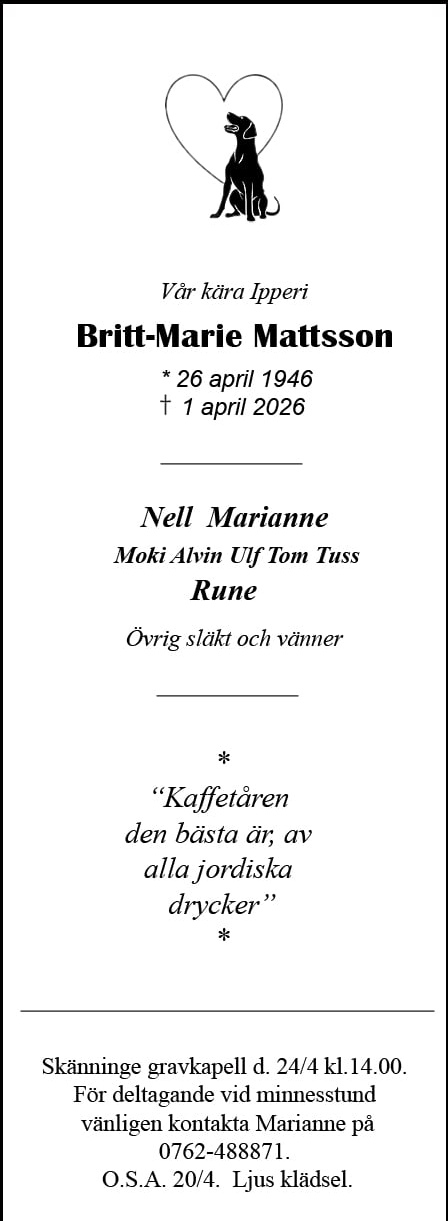 Var med oss och dela hälsningar, bilder och filmer. Tillsammans kan vi återuppleva minnen och fina stunder med Britt-Marie.