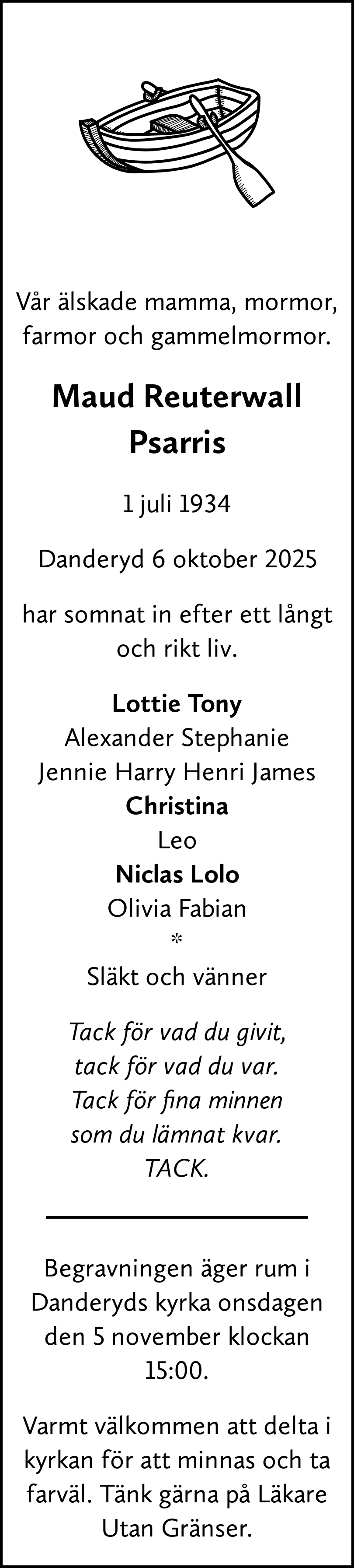 Var med oss och ta farväl av vår älskade mamma, mormor, farmor, gammelmormor och vän. Efter 91 år fyllda av äventyr har