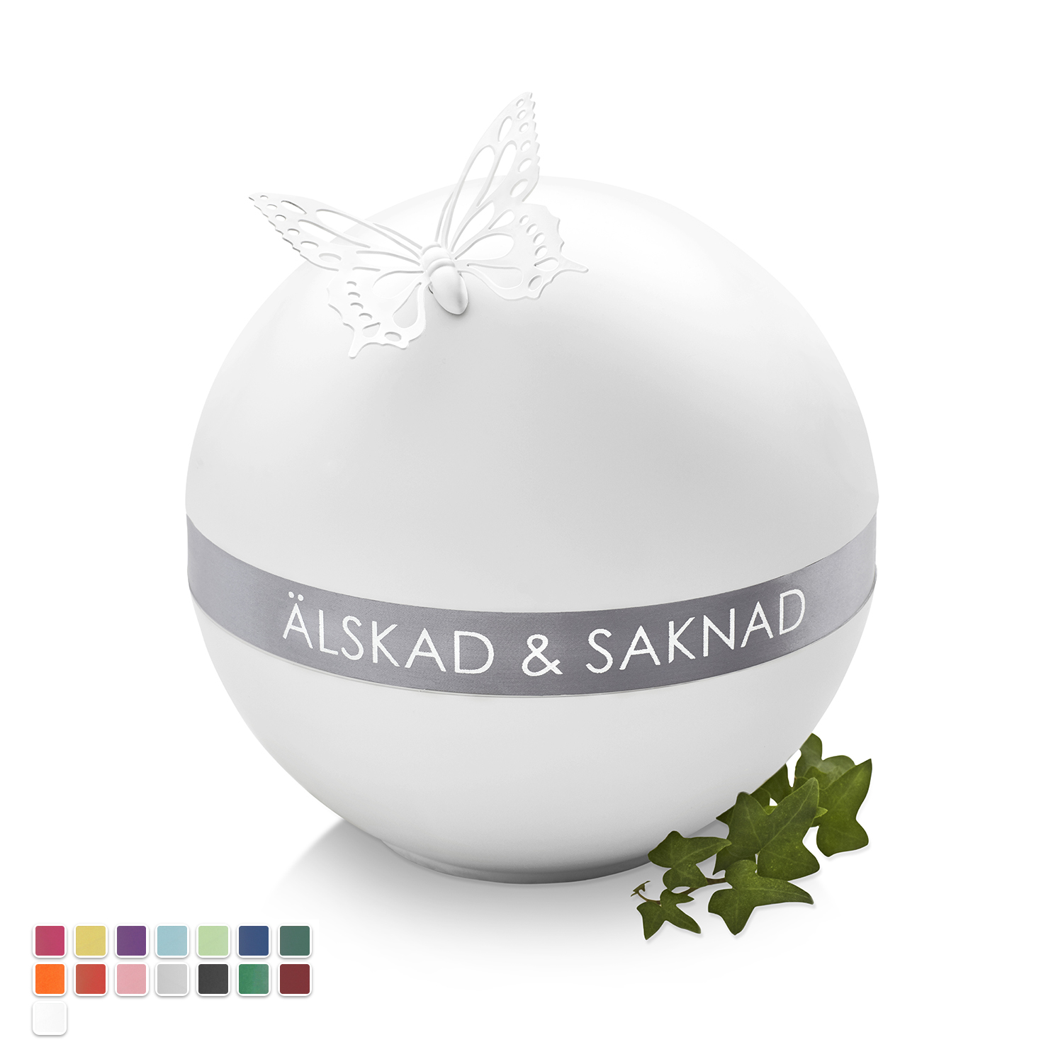 TELLUS är en klotformad, ekologisk och 100% nedbrytbar urna. Urnan är vit men bandet anpassas efter era önskemål, både till färg (14 olika färger) och personlig hälsning (max 72 tecken). Till urnan hör också en fjäril som fästs med magnet under ceremonin, som sedan kan förflyttas till de anhörigas hem och fästas på en träram till minne av den avlidne. Det finns 14 olika band att välja bland och dessa kan kompletteras med en personlig hälsning (max 72 tecken) i antingen typsnittet Century gothic (versaler) eller Edwardian Script (kursivt). För varje såld urna får 5 kr till välgörenhetsorganisationen WaterAid.